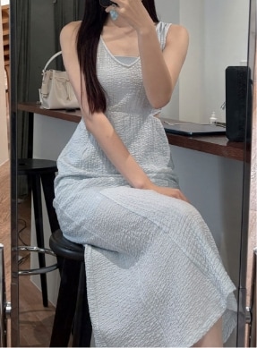 ストレートネックラインと華奢な2本ストラップが
