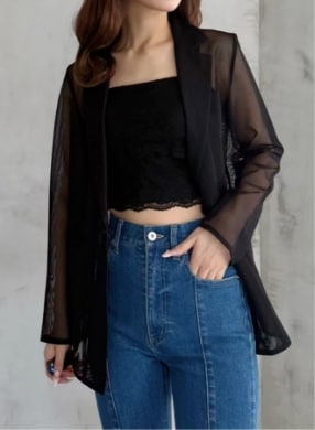 メンズライクなボトムスに透け感のある羽織りで
